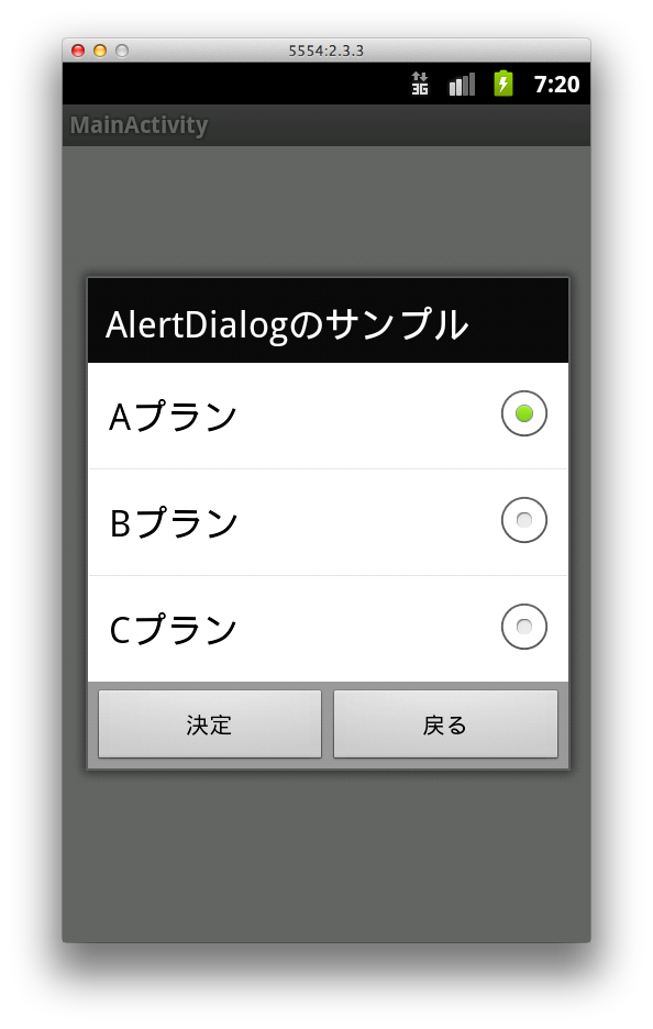とりあえずプロジェクトを作成したらManifestFileにActivityを追加してからプログラムを作る。 忘れてることを忘れる(笑) public class MainActivity extends Activity { private EditText ed; @Override public void onCreate(Bundle savedInstanceState) { super.onCreate(savedInstanceState); setContentView(R.layout.activity_main); ed = (EditText)findViewById(R.id.editText); } public void intentButtonClickListener(View view){ final String edString = ed.getText().toString(); AlertDialog.Builder ab = new AlertDialog.Builder(this); ab.setTitle("別アクティビティの起動"); ab.setMessage(edString+"を別のアクティビティで表示します"); ab.setPositiveButton("はい", new DialogInterface.OnClickListener() { public void onClick(DialogInterface dialog, int which) { // Intent生成 new Intent(自アクティビティ,送り先Activity名.class); Intent intent = new Intent(MainActivity.this,SubActivity.class); // 送りたい情報の設定・・・① intent.putExtra("MESSAGE",edString); startActivity(intent); } }); ab.setNegativeButton("いいえ", new DialogInterface.OnClickListener() { public void onClick(DialogInterface dialog, int which) { // TODO Auto-generated method stub } }); ab.show(); } } SubActivity public class SubActivity extends Activity { private String text; private TextView textview; @Override public void onCreate(Bundle savedInstanceState) { super.onCreate(savedInstanceState); setContentView(R.layout.activity_sub); textview = (TextView)findViewById(R.id.displayview); Intent intent = getIntent(); text = intent.getStringExtra("MESSAGE"); textview.setText(text); } public void backButton(View v){ finish(); } @Override public boolean onCreateOptionsMenu(Menu menu) { getMenuInflater().inflate(R.menu.activity_sub, menu); return true; } } xmlファイルは割愛 id名は MainのEditTextの名前はeditText SubのTextViewの名前はdisplayview としています。 ①putExtra(第1引数,第2匹数); 第1引数はキー 第2引数はデータ SharedPreferencesのような感じ ArrayListを送りたい場合はputExtraではなく putIntegerArrayListExtra put◎◎ArrayListExtraとなる。 |